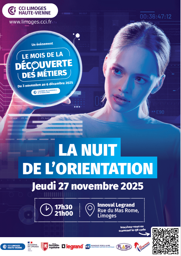 3iL Ingénieurs participera à la 3ᵉ édition de la Nuit de l’Orientation, organisée par la CCI de Limoges et de la Haute-Vienne, le jeudi 27 novembre 2025, de 17h30 à 21h00, au sein du groupe Legrand.
